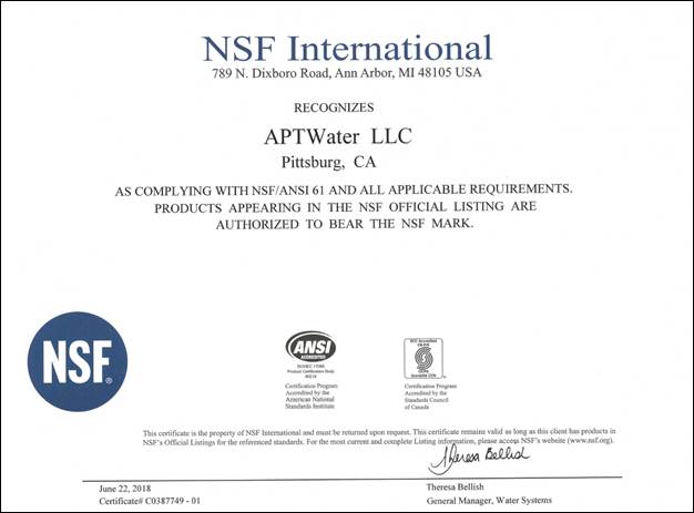 麥王環(huán)境美國全資子公司APTwater ARoNite技術(shù)獲得NSF技術(shù)認(rèn)證